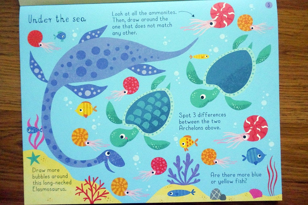 Young children will have fun completing the dinosaur-themed activities in this tear-off pad. They are invited to spot differences, find and count all kinds of animals, draw paths through mazes, and complete pictures by joining the dots, or drawing over dotted lines. On the back of each sheet they can learn about the dinosaurs and colour a simple black and white dinosaur picture. There is a guide to saying all the dinosaur names too.